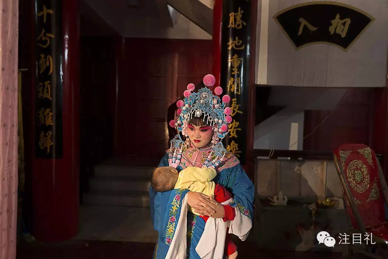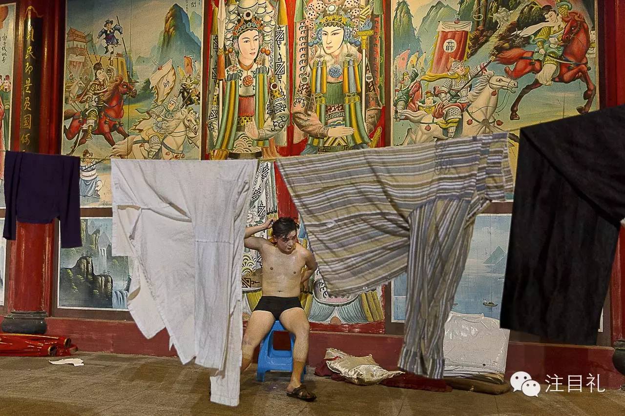 29岁的武生演员张家强,在浙江省温州市龙港镇的一处寺庙里演出。一整场武戏表演下来,浑身被汗水湿透。张家强加入温州鑫海京剧团剧团已经五年,每年大约演出300天,每天收入为大约200元,在剧团里算是中等的收入。2015年11月7日,浙江省温州市龙港镇。