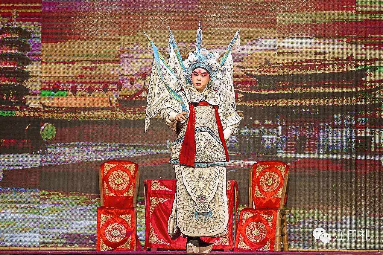 张家强在《龙凤呈祥》中饰演赵云。为了符合当地观众的习惯,传统京剧舞台的刺绣布景“守旧”已经被电子LED显示屏幕所代替。屏幕上显示的照片是剧团老板的儿子从互联网上下载的。2015年11月8日,浙江省温州市平阳县。