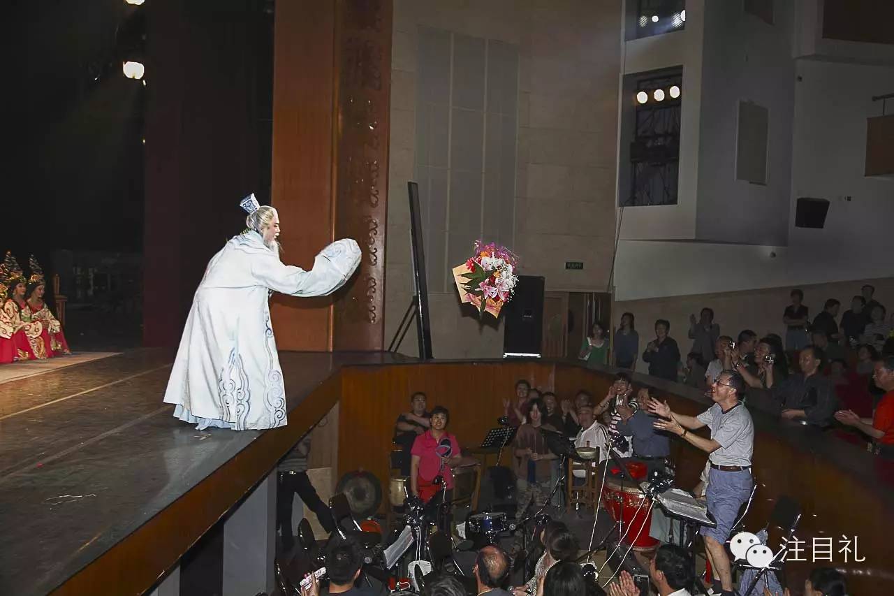 演出结束,专业京剧演员杨雪梅为台湾票友捧花。来自港台的京剧票友经常出高价邀请内地专业京剧院团为自己配戏。2005年9月24日,济南鲁艺剧院后台。