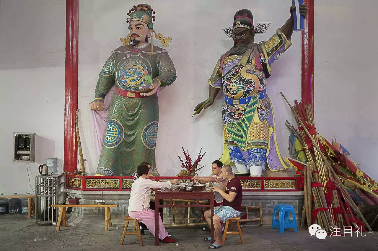 按照当地的风俗,演出期间,剧团所有成员的吃、住都在寺庙里。温州鑫海京剧团的老板张眀豹一家的餐桌就临时放在神像脚下。 2015年11月7日,浙江省温州市鳌江镇。
