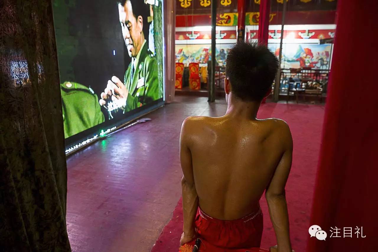 2015年11月7日,19岁的京剧演员王阳阳在为晚上的演做热身活动。在浙江省温州市龙港镇的流动京剧团,每次开演前都会用舞台上的大屏幕,播放热播的电视剧,以招徕观众。