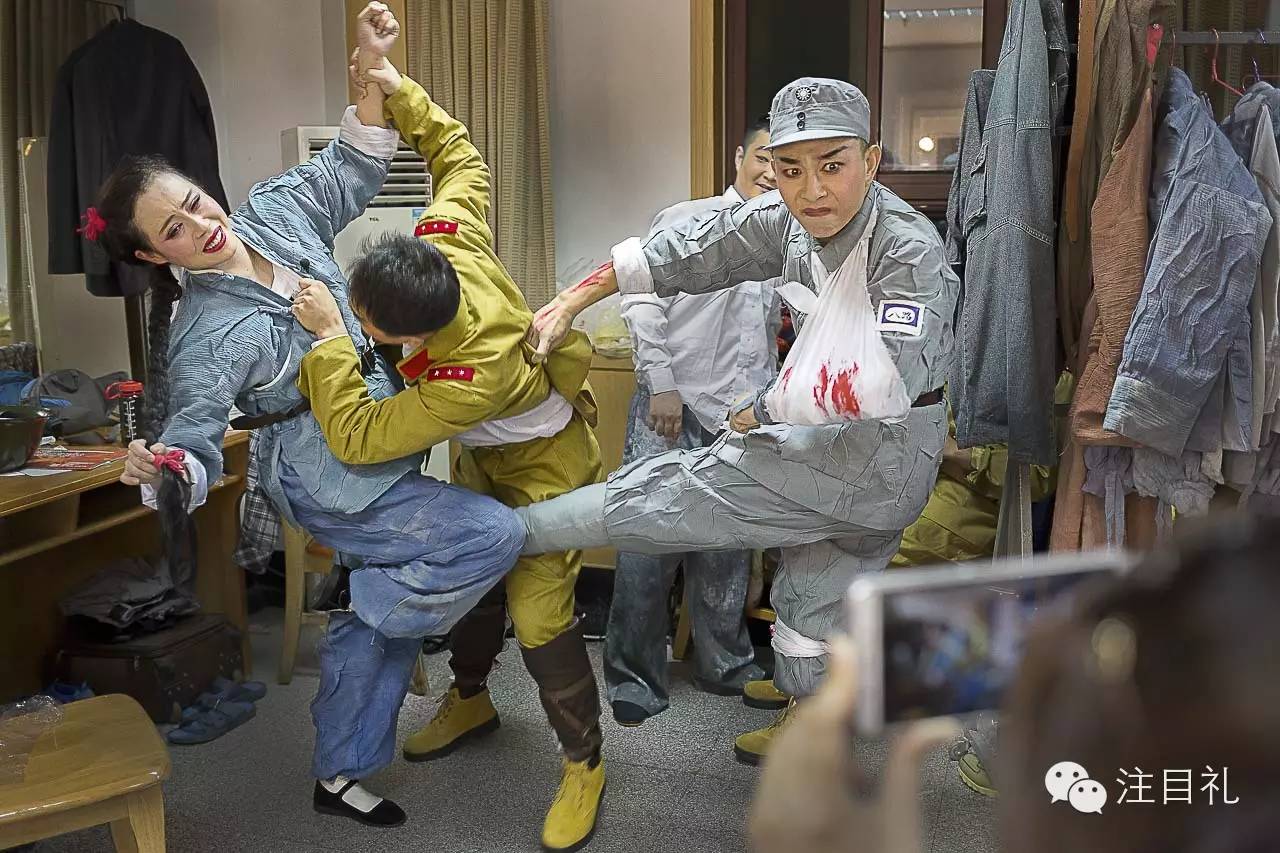 在一场庆祝抗战胜利题材的演出中,年轻演员们在后台用手机拍照取乐。2015年9月2日,济南。