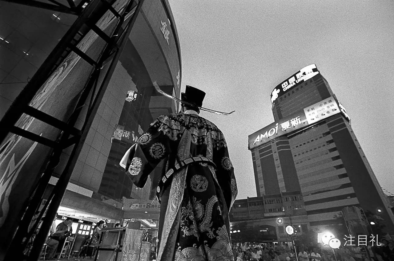 在闹市区一家大型商店,为庆祝其八周年店庆,在商场门前搭建了一个临时露天舞台。当晚上演《铡美案》,演员马济生扮演包公。2004年8月,济南。