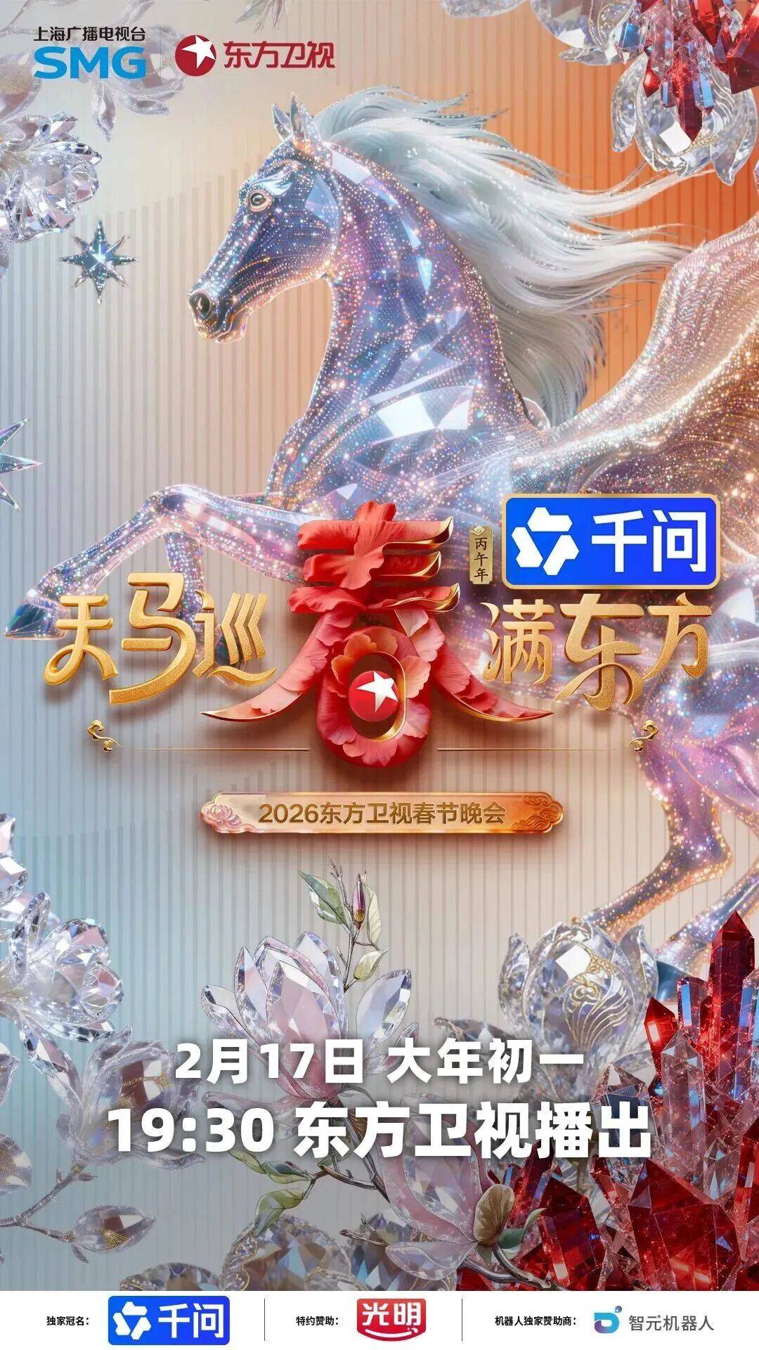 天马巡春春满东方,2026东方卫视马年春晚正式官宣。2月17日大年初一19:30,锁定「天马巡春 春满东方」2026东方卫视春节晚会,奔赴马年合家欢盛宴,在灯火相映、阖家同欢的年味时刻,一起迎接新春好光景。